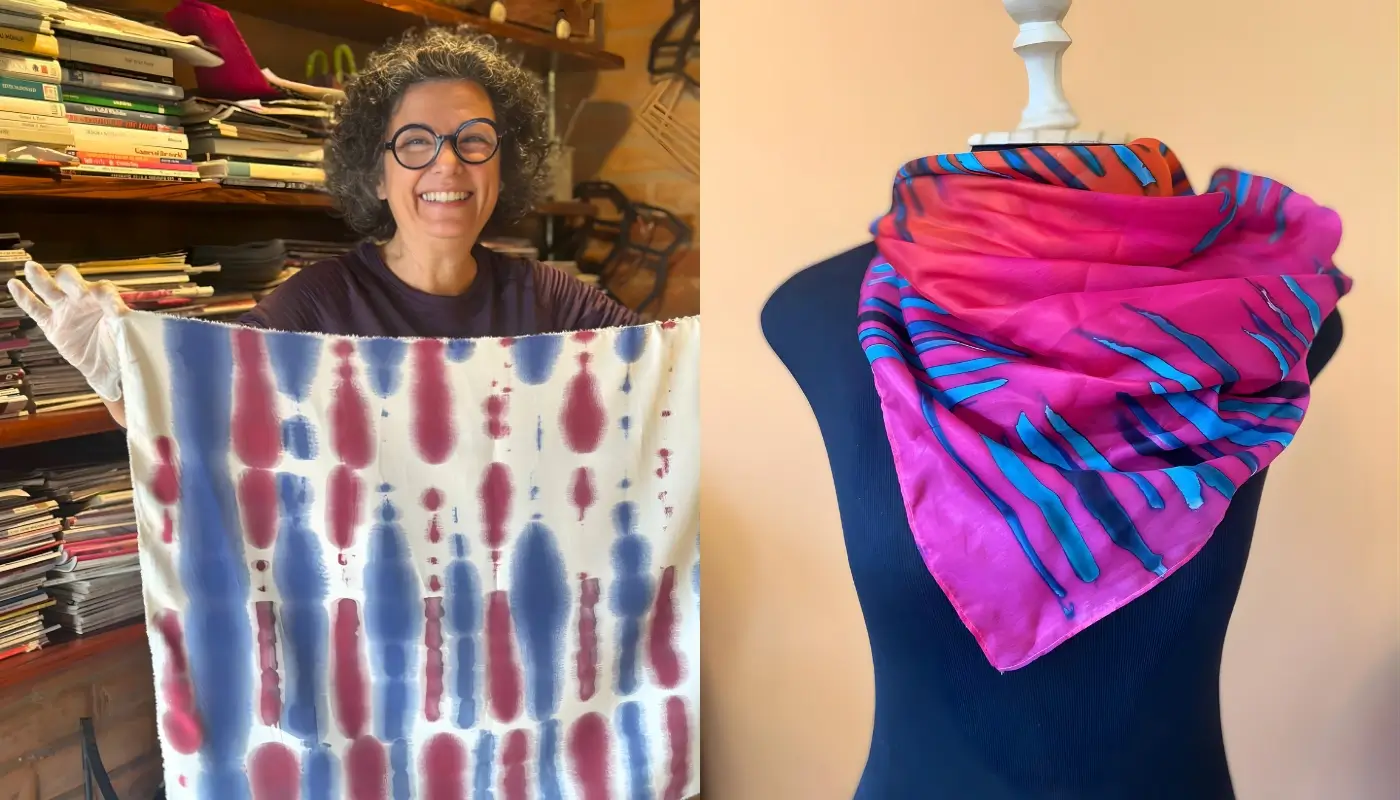 Você aprenderá diferentes formas de aplicar tintas sobre a seda, criando efeitos únicos a partir do movimento e da leveza das cores sobre o tecido.